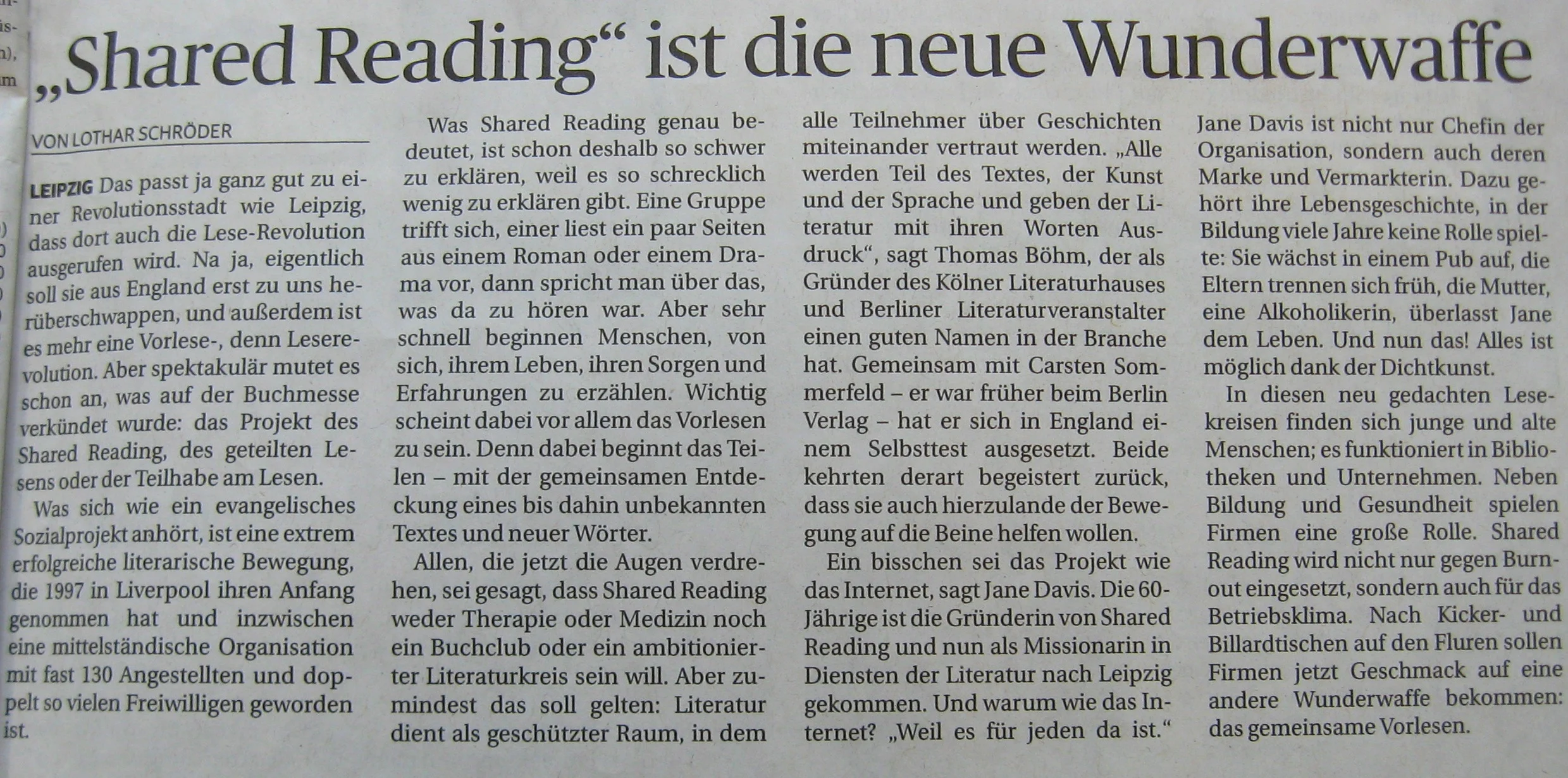 "Spektakulär mutet es an, was auf der Buchmesse verkündet wurde: das Projekt des Shared Reading, des geteilten Lesens oder der Teilhabe am Lesen. (...)